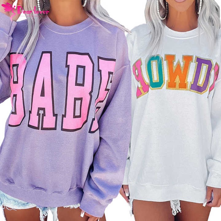 Dear-Lover Custom OEM ODM Winter Women Long Sleeve Crew Neck Oversized Pullover Letters Print Ribbed Graphic Sweatshirt